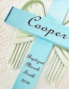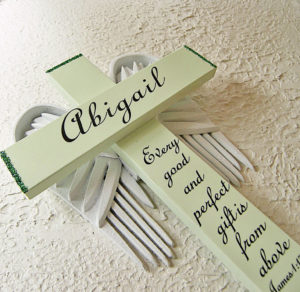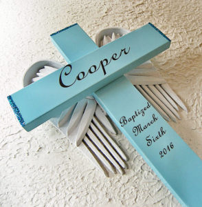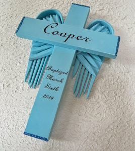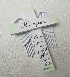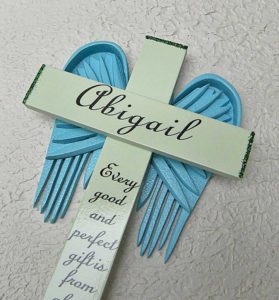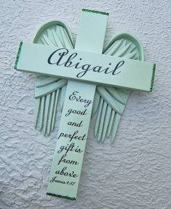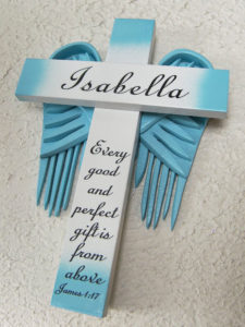 Personalized Angel of the Lord Cross in White with Blue and Blue Wings ‘Every Good and Perfect Gift is from Above’ James 1:17