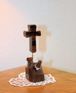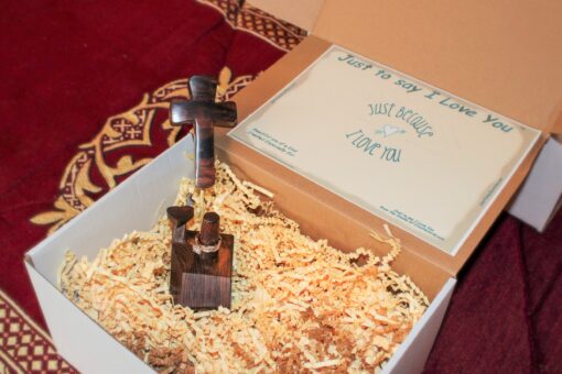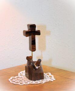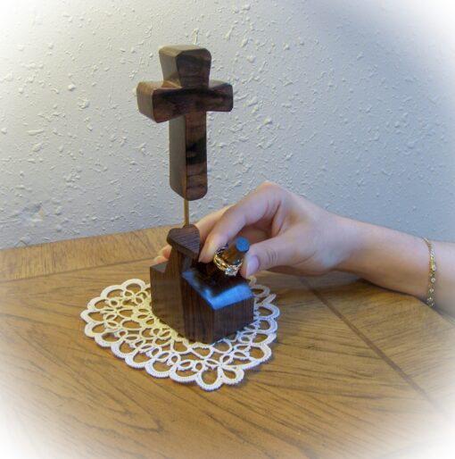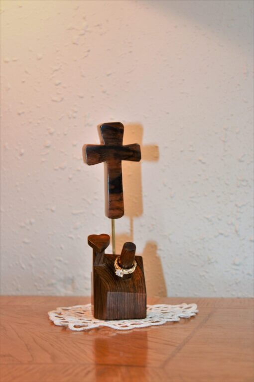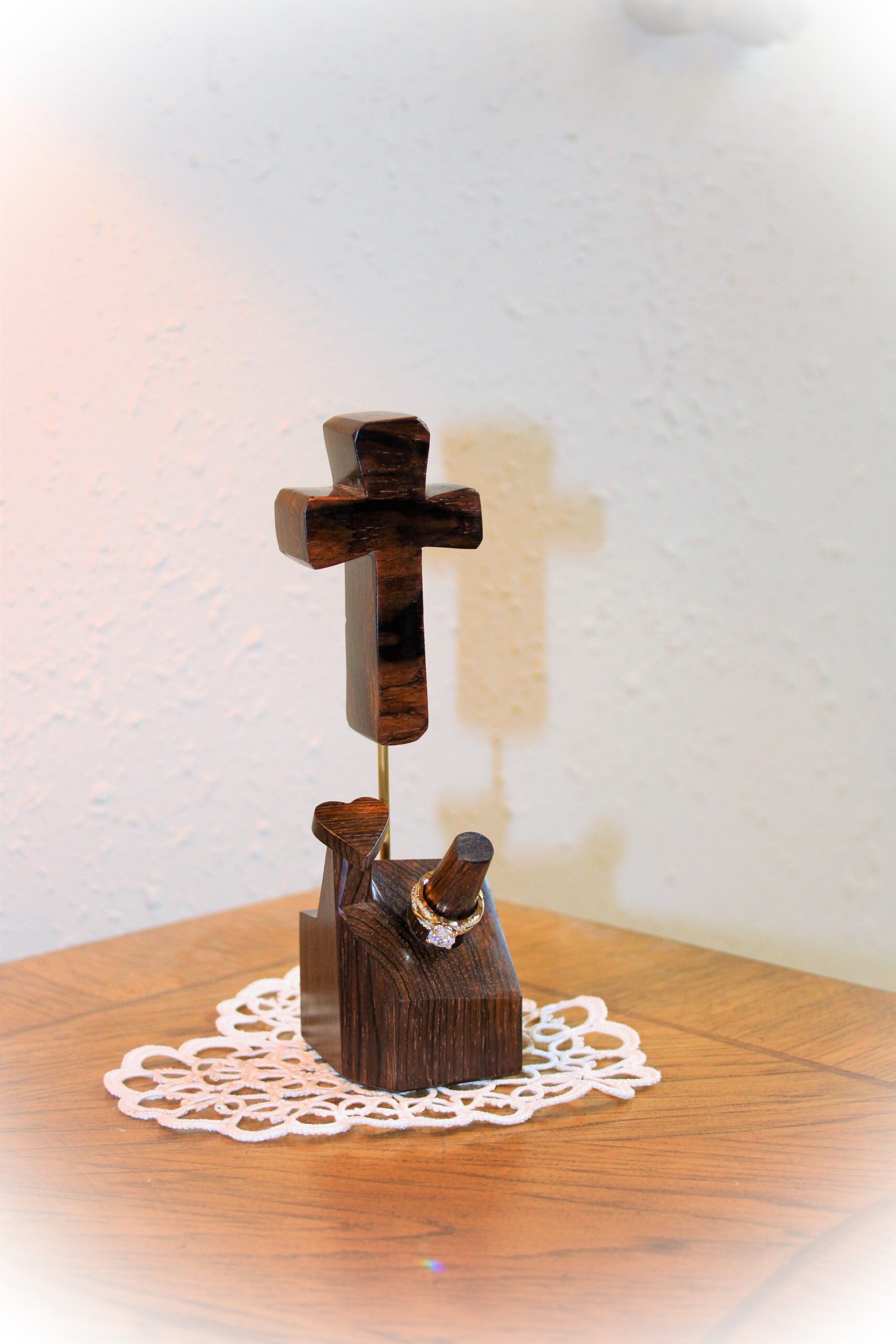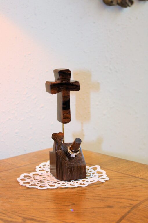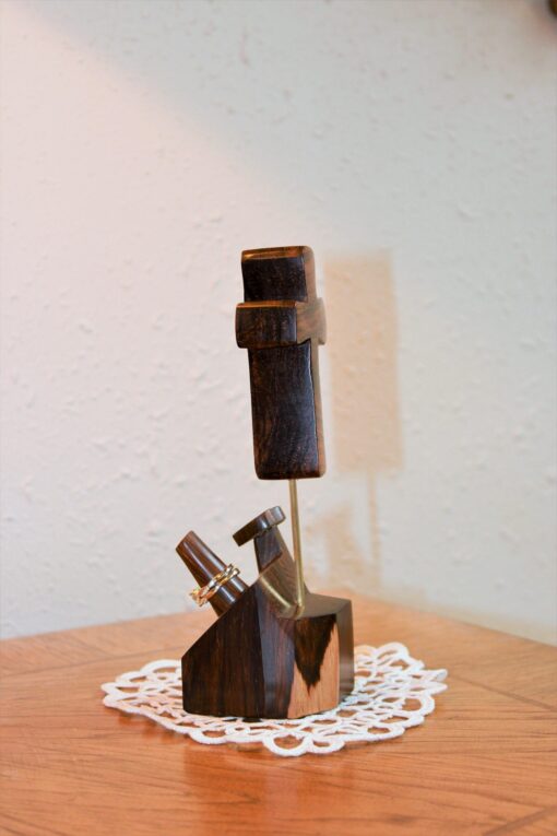 Handcrafted from richly grained rare Cocobolo wood, this sacred ring holder is a striking fusion of faith and craftsmanship. A beautifully carved cross rises from the solid wood base, reminding us of the divine foundation of true love and commitment. The stepped platform features a matching Cocobolo ring post, ideal for displaying a wedding or engagement ring. Thoughtfully designed and polished all natural wood, this piece serves as a spiritual keepsake—perfect for couples who see their union as a covenant not only with each other, but with God.
