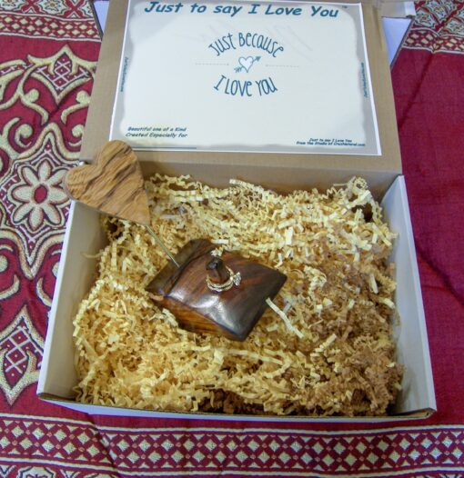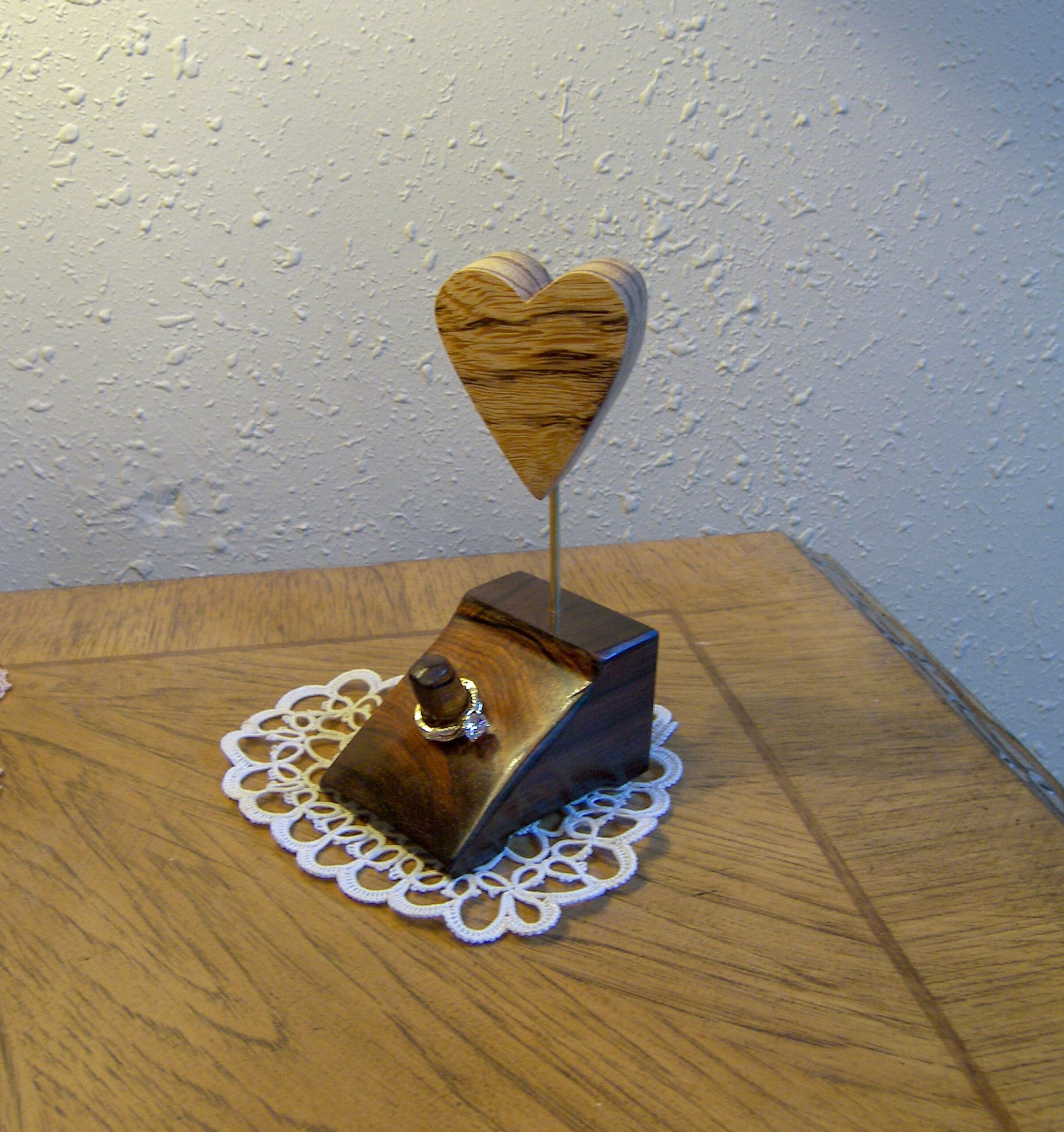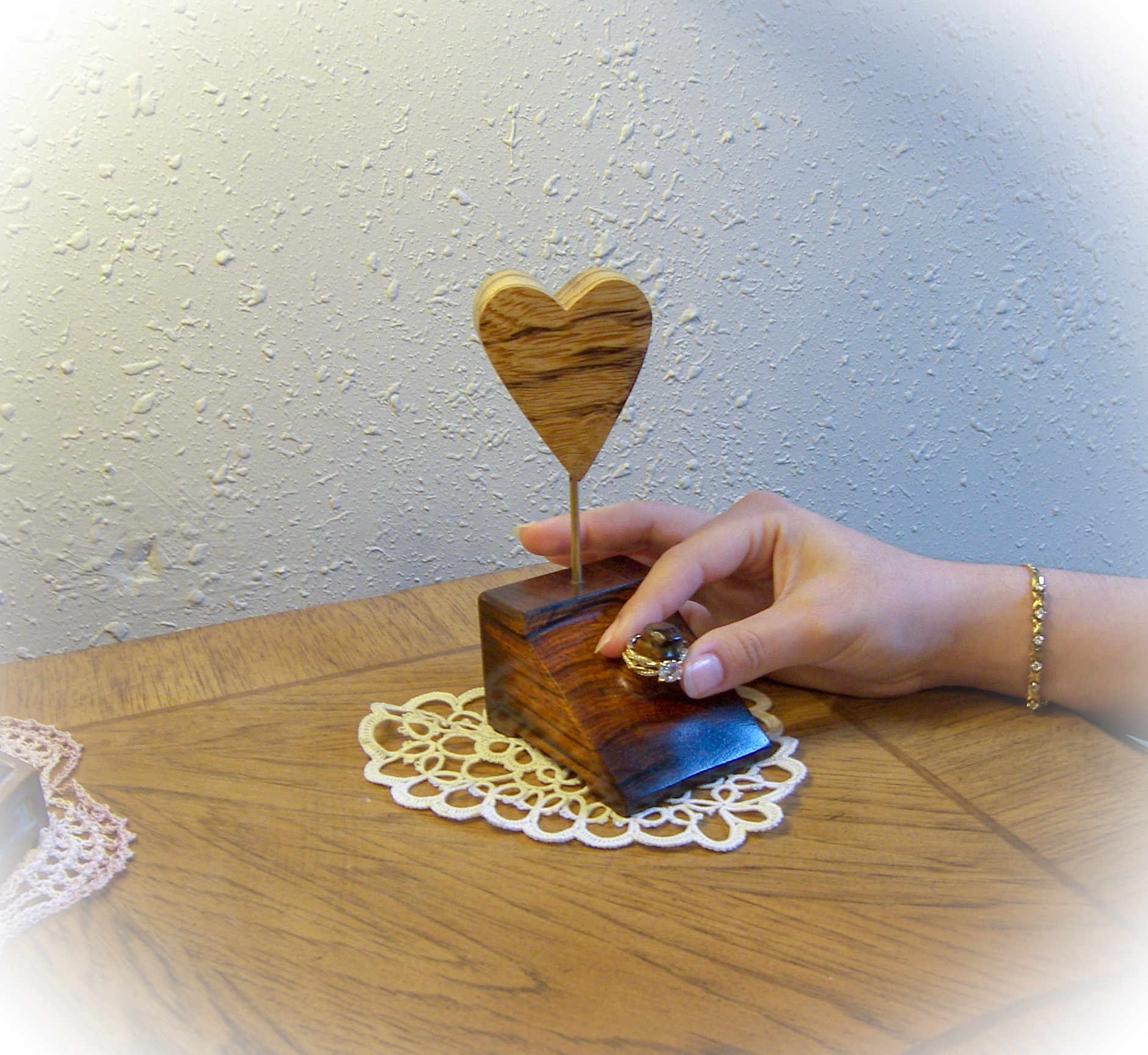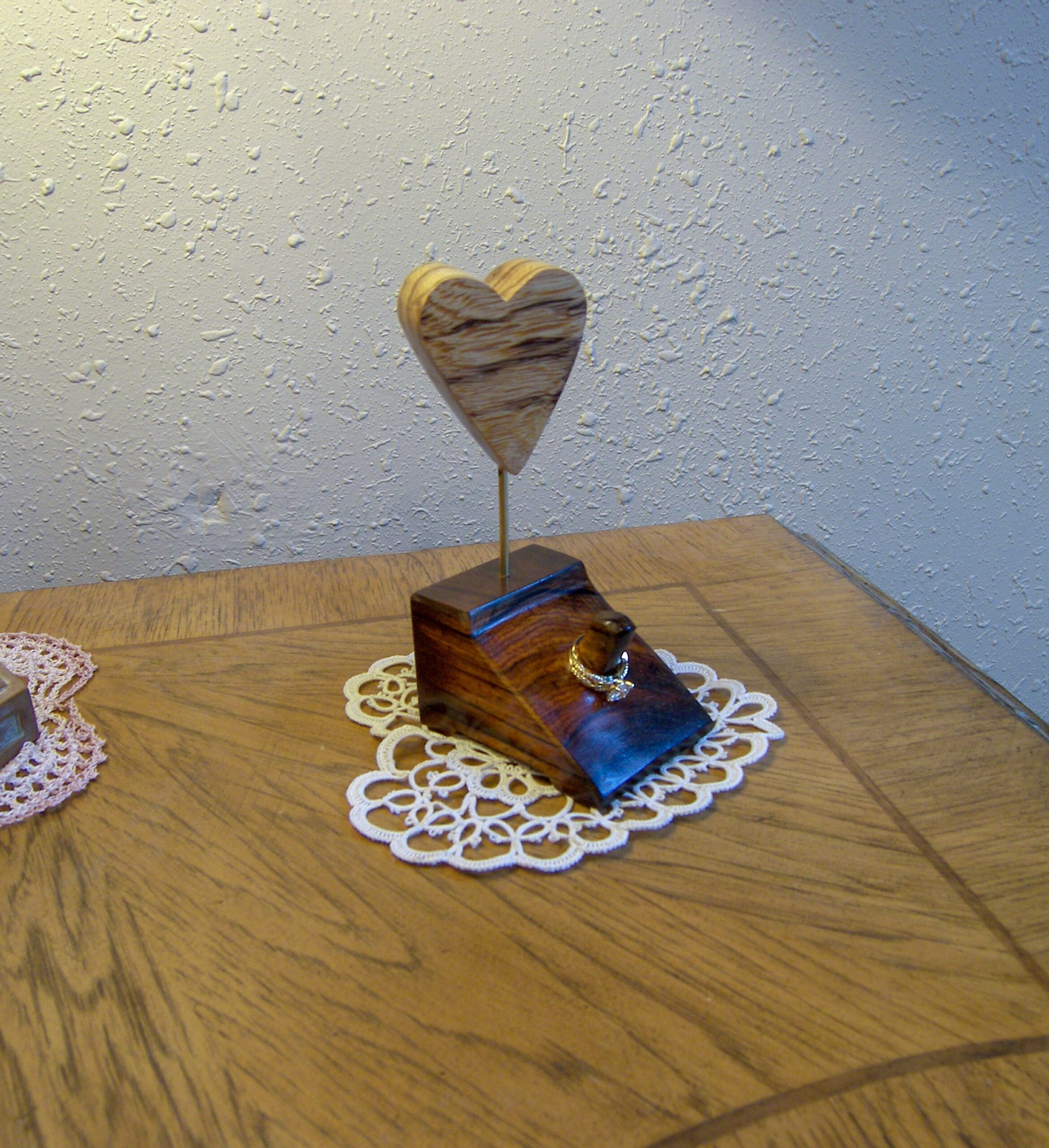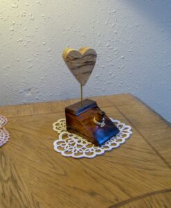 A stunning tribute to lasting love, this handcrafted wedding ring holder features a beautifully sculpted Marble wood heart, known for its striking grain and warm golden tones. The heart is elevated on a brass post above a sculpted Rare Cocobolo wood base, gracefully sloped and natural polished. A polished ring post, carved from matching Cocobolo wood, provides an elegant place to display your cherished ring. This unique creation blends organic beauty with symbolic design—perfect as a wedding or anniversary gift, or a statement keepsake for your sacred union.