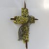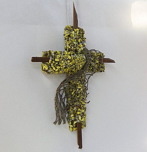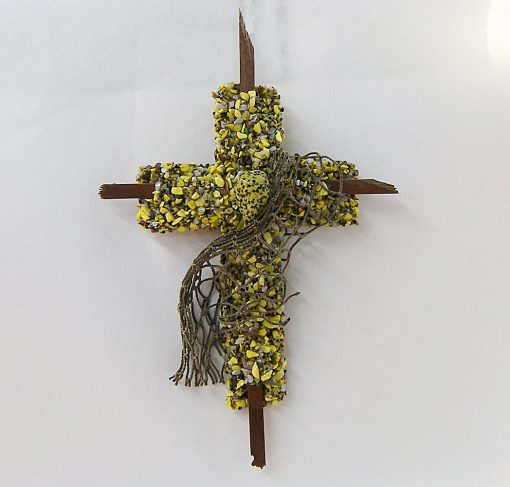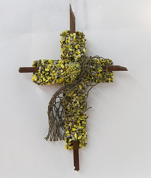 This Cross is made of yellow stones that cover the wooden cross of dark walnut wood, then I wrap actual fish net around the cross.
