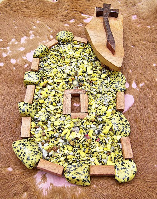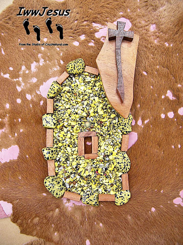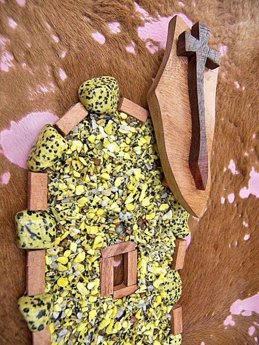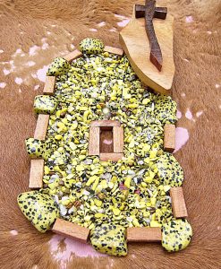 Yellow Dalmatian Stone and Honey Brown Mesquite wood is the Border of this plate inlay with Yellow Dalmatian stones.