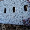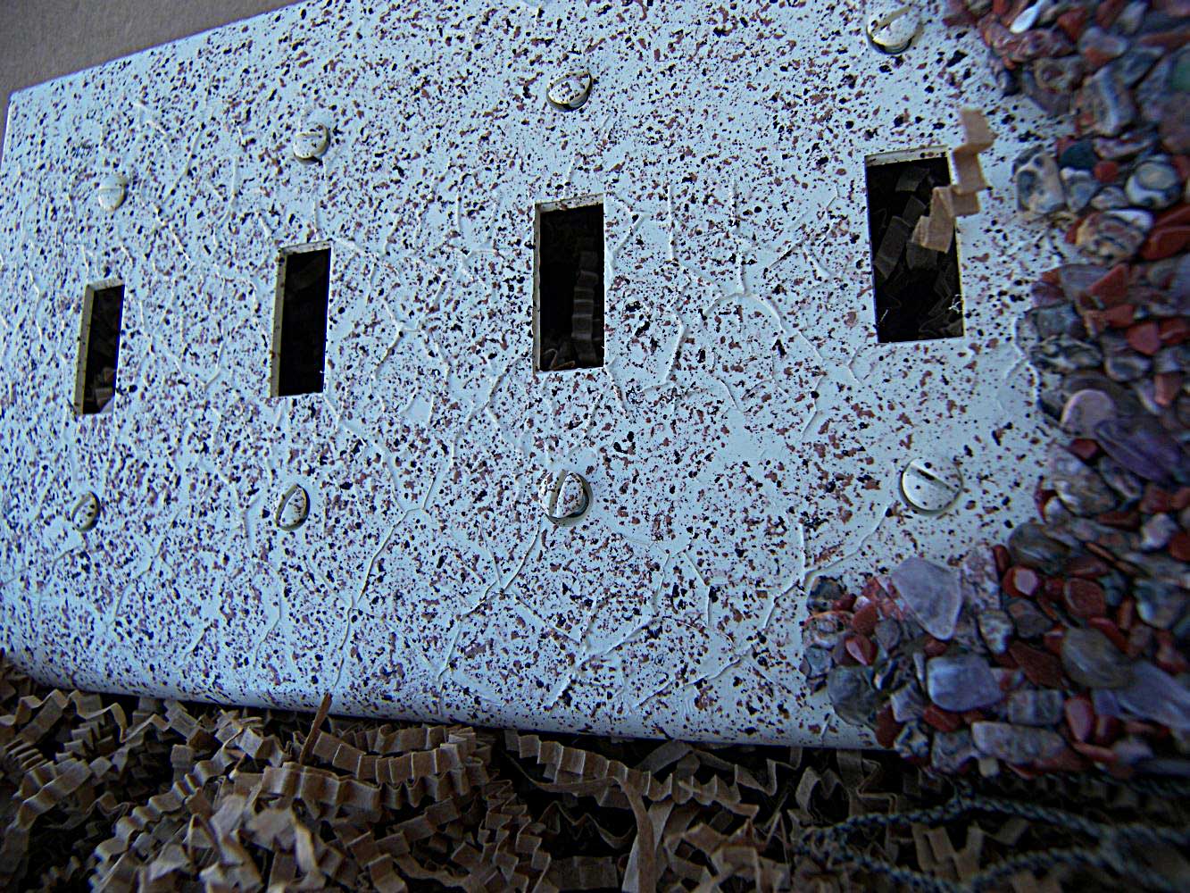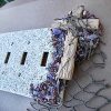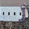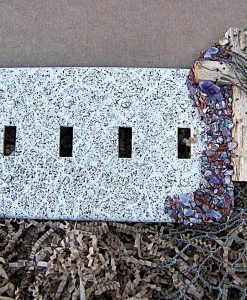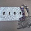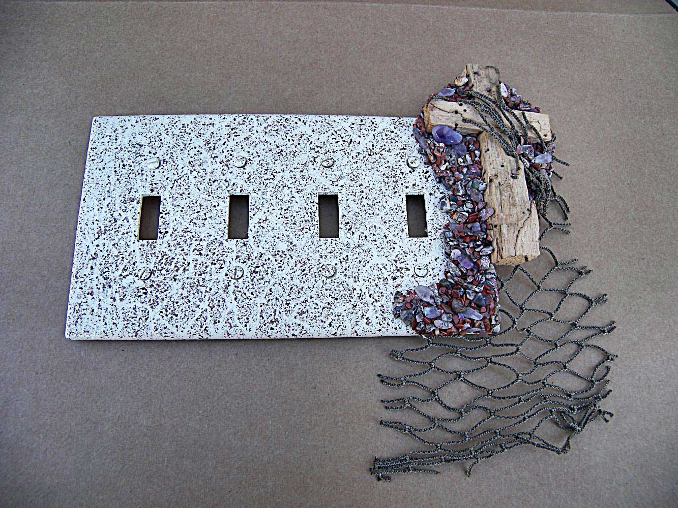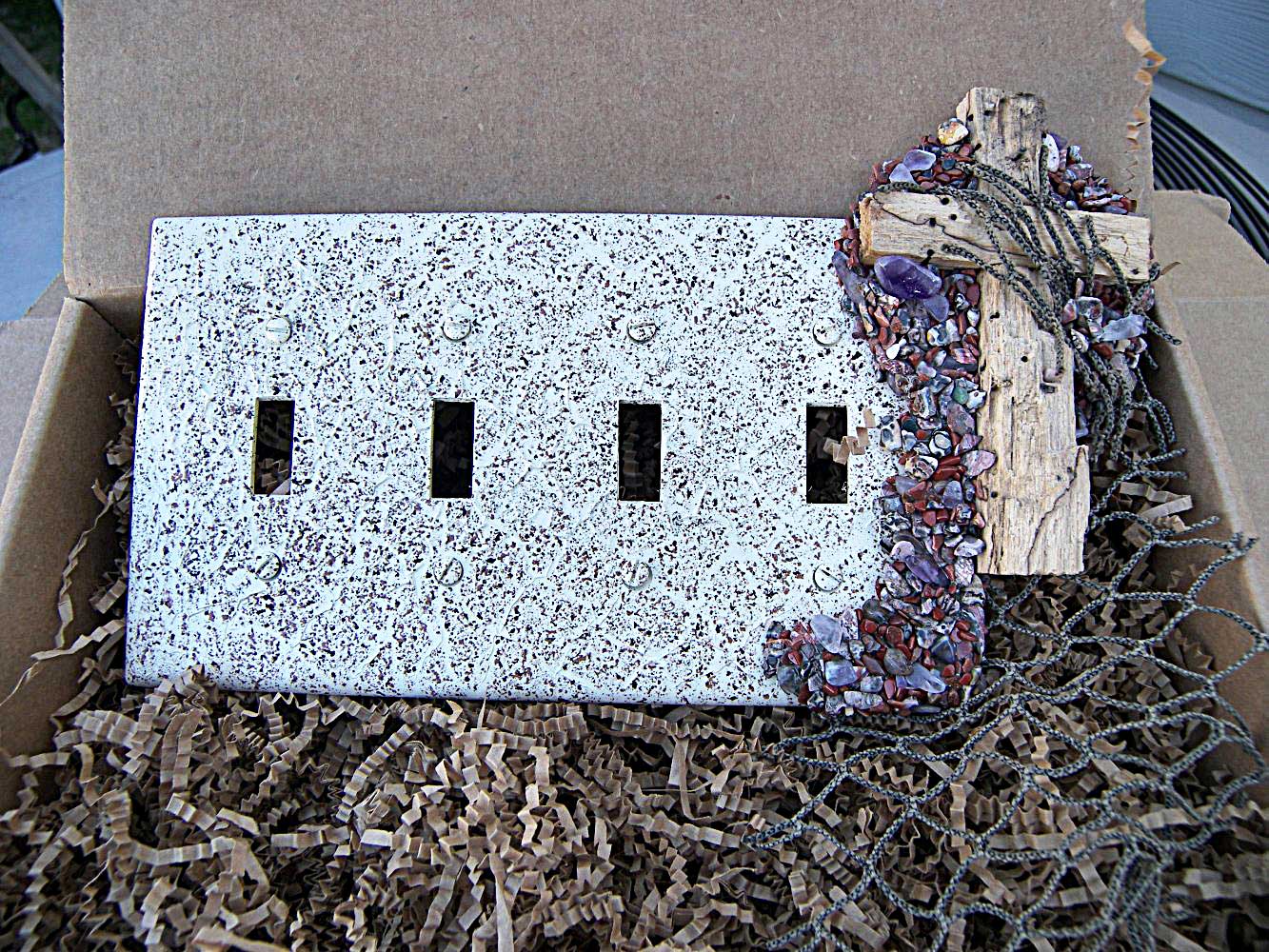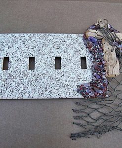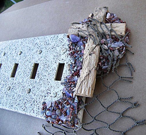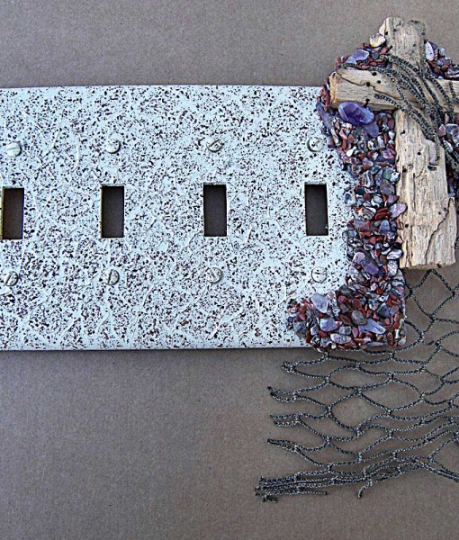 Switch plate cover Cross is made rough from Spalted Tamarind from Africa, with fish net, amethyst stone, leopard skin stone, and red jasper stone.