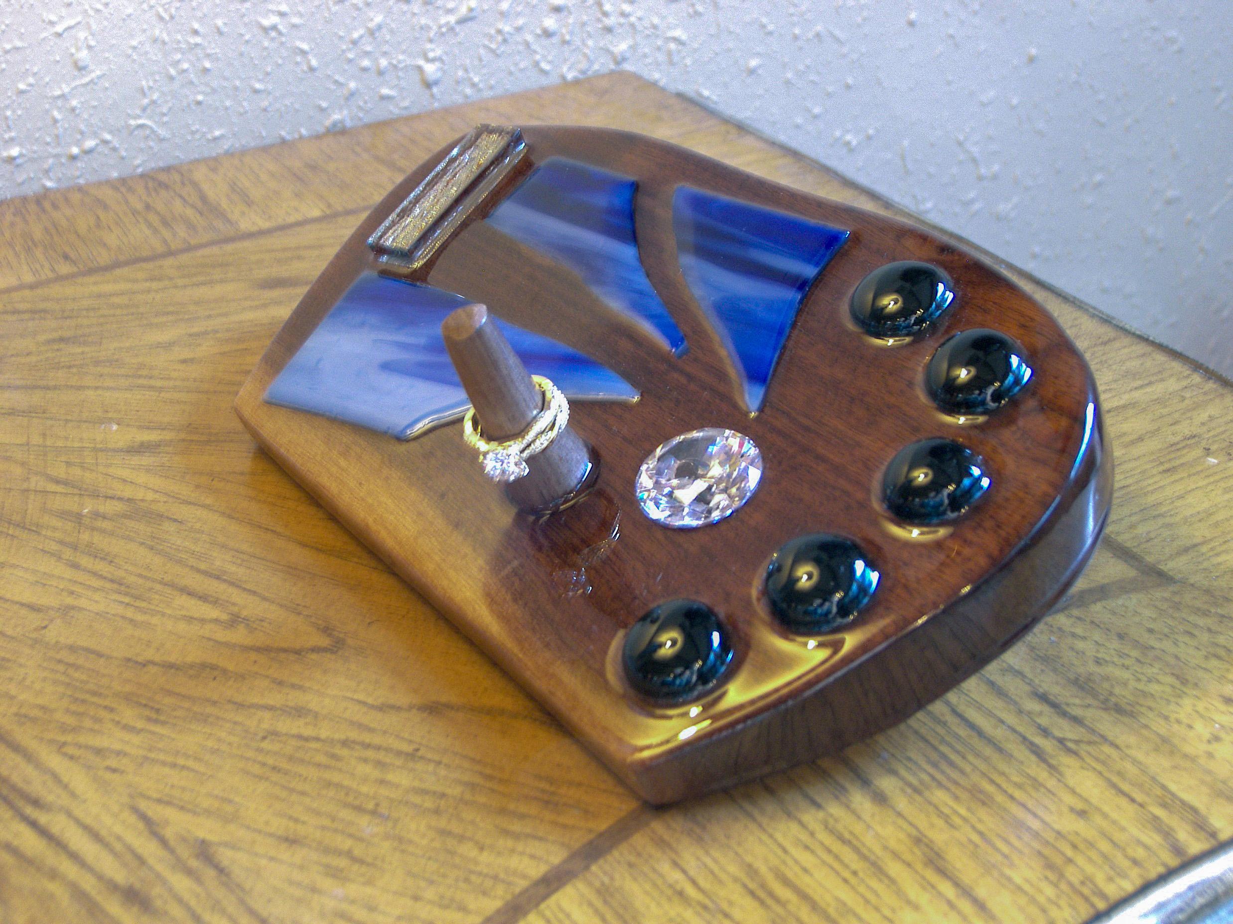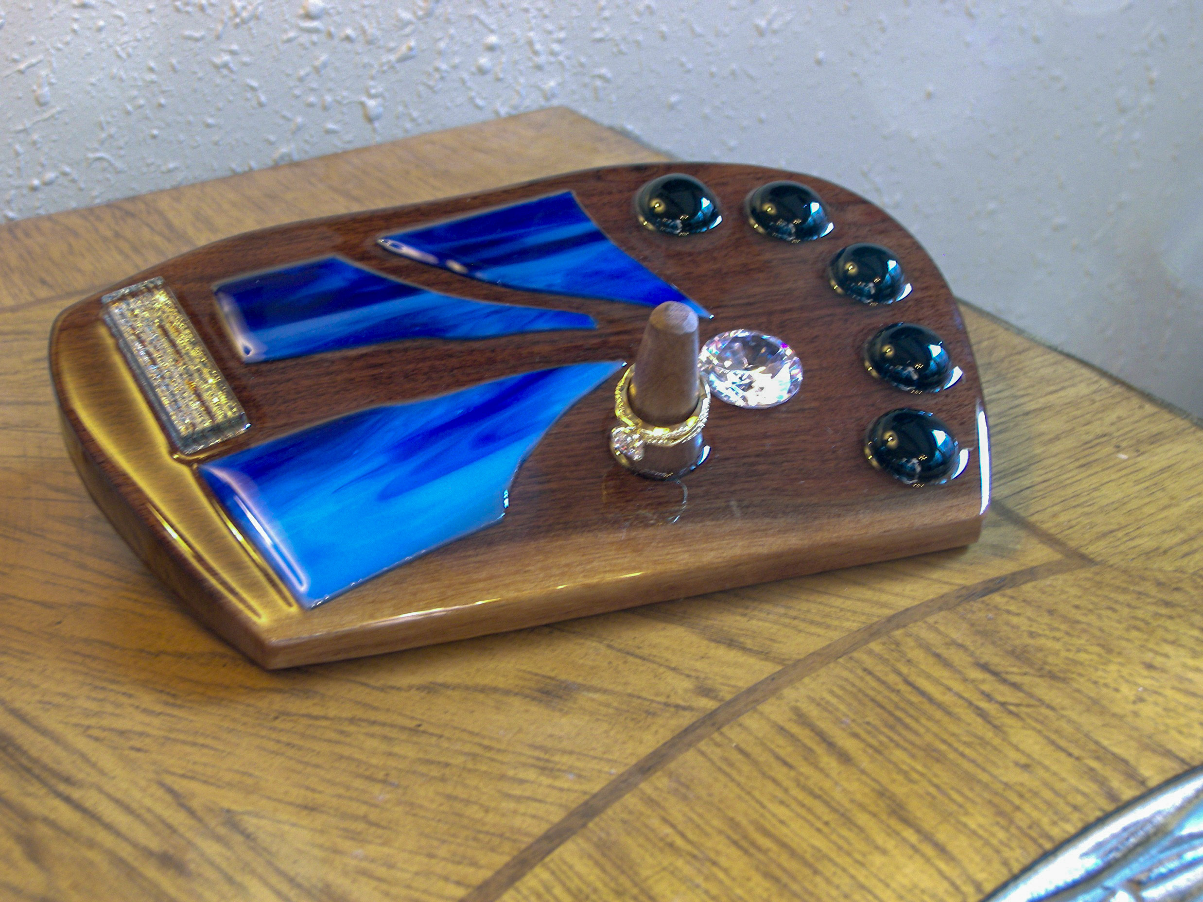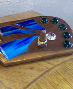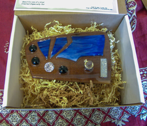 Living Waters is a flowing, faith-infused wedding ring holder that captures the essence of divine movement and enduring love. Carved from deep walnut wood and adorned with waves of vibrant cobalt and sapphire-toned stained glass, this piece evokes the sacred power of water—life-giving, cleansing, and unending. The gentle curves and glass inlays flow like a river across the surface, leading to a polished wood post that securely holds your most cherished ring. Subtle black cabochons and a shimmered glass accent add to its depth and grace. A visual prayer of motion and stillness—made to cradle vows that flow from the heart.