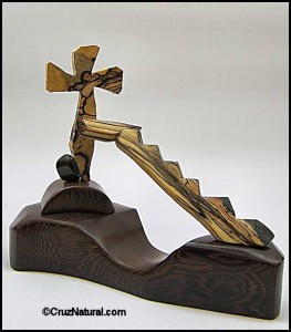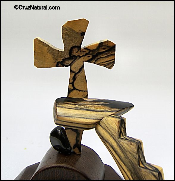 Jesus looking out from behind the clouds. The Eye of Jesus actually looks as if he is looking right at you. This Black & White Ebony Cross is set leaning on a polished black stone. Let God be your rock and he will support you. This my Affirmation Cross. The Face of Jesus is looking out at you from the Clouds. The face of Jesus is natural in the wood. The stairs are able to swivel around 360. This 360 movement allows us to decide which direction we would like for our lifes. Up to God or? At the top of the stairs is a small platform for you, as Jesus welcomes you home.. The stair case is also made of black & ebony wood. The base is made of polished Wenge wood. This piece stands 8″ tall at the top of the cross. The span of the cross is 3″ & is 5 1/2″ tall. The over all width of the complete piece is is 5″ with a length of 10″